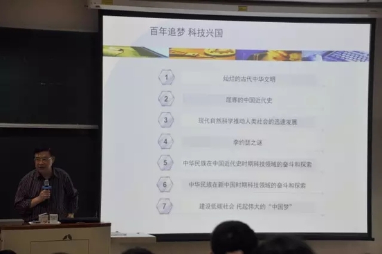 刘院士讲课的主题是:百年追梦,科技兴国。他从灿烂的古代中华文明讲起,指出中华文明是与古埃及文明、古巴比伦文明、古印度文明、古希腊文明并列的古老文明,也是其中唯一延续至今而没有中断的文明,这有赖于科学技术的推动,科学技术是人类在认识和改造自然的伟大实践中获得的丰厚的知识财富。古老的中华文明在起跑线上并没有落后,是占有领先地位的。