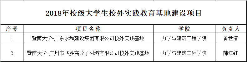 根据《关于公布2018年度校级大学生校外实践教育基地建设项目的通知》(暨教通〔2018〕28 号)的要求,学校组织开展了大学生校外实践教育基地建设项目的申报工作。根据教育部、广东省教育厅相关文件以及《关于启动德赢VWIN官方网站“本科实践教学基地建设与管理平台”建设的通知》等精神,相关基地提交材料,经过学院审核推荐、教务处组织评审等诸多方面,最终学校共计获批10项,其中我院申请的大学生校外实践教育基地建设项目获批2项。名单如下:
