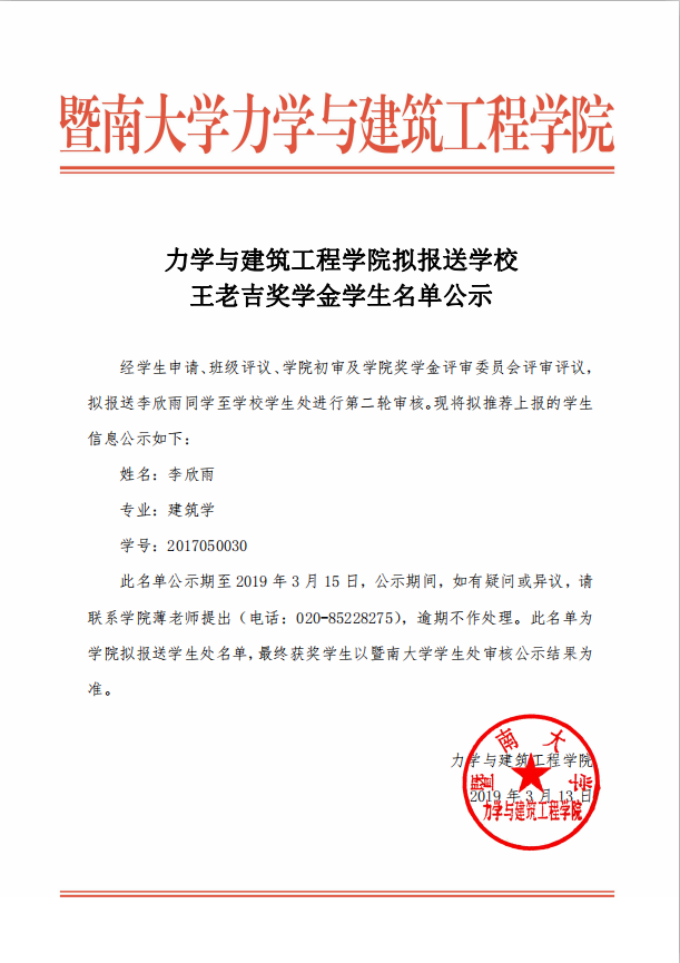 德赢VWIN官方网站拟报送学校王老吉奖学金学生名单公示
