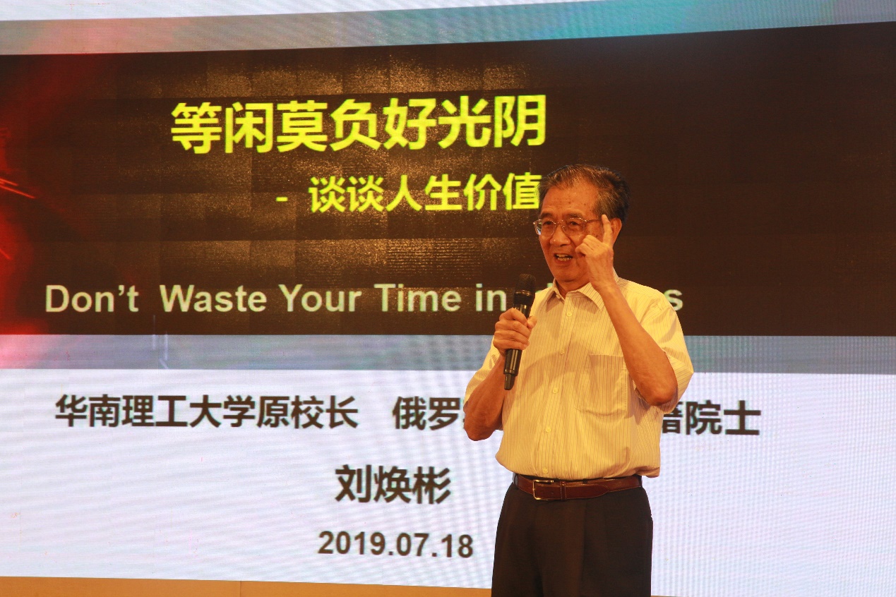 华南理工大学原校长、俄罗斯工程院外籍院士、广东院士联合会咨委会委员刘焕彬以《等闲莫负好光阴》为题,从自己的成长经历出发,阐述了“三种人生”“三句名言”和“三种感悟”。