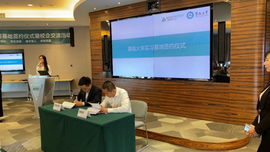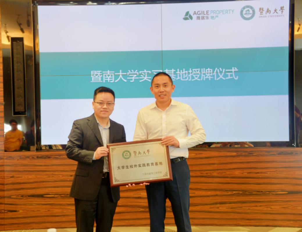 当天下午,在雅居乐员工的带领下,师生们参观了雅居乐3FF多功能展厅,了解了雅居乐从创立至今的发展历程。为校企搭建构筑产学结合的人才培养平台,双方就科学研究、课程嵌入、校外导师等方面深入沟通交流并签订共建协议。雅居乐控股公司人力行政部总经理张咏、雅居乐地产集团广州区域总裁张海明、人力行政部总监张筱、人力资源经理汤瑞萍、人力行政部资深人力资源经理李青蓉、人力行政部高级行政经理黎姮、广州区域总裁高级秘书古成文(德赢VWIN官方网站2013级工程力学)、雅居乐地产集团广州区域人力资源专业师梁俊严(德赢VWIN官方网站2014级土木工程)等参加了德赢VWIN官方网站大学生校外实践教育基地签约及授牌仪式。
