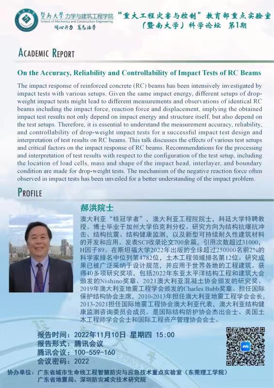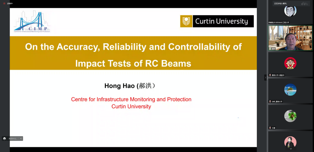 2022年11月10日下午,“重大工程灾害与控制”教育部重点实验室(暨南大学)科学论坛第1期在线上成功举办,此次论坛邀请到澳大利亚“桂冠学者”郝洪院士作题为“On the Accuracy, Reliability and Controllability of Impact Tests of RC Beams”的特邀报告,德赢VWIN官方网站德赢VWIN官方网站及国内其他高校的师生学者300余人参加论坛。本次论坛由学院主持工作副院长兼党委副书记聂振华教授主持。