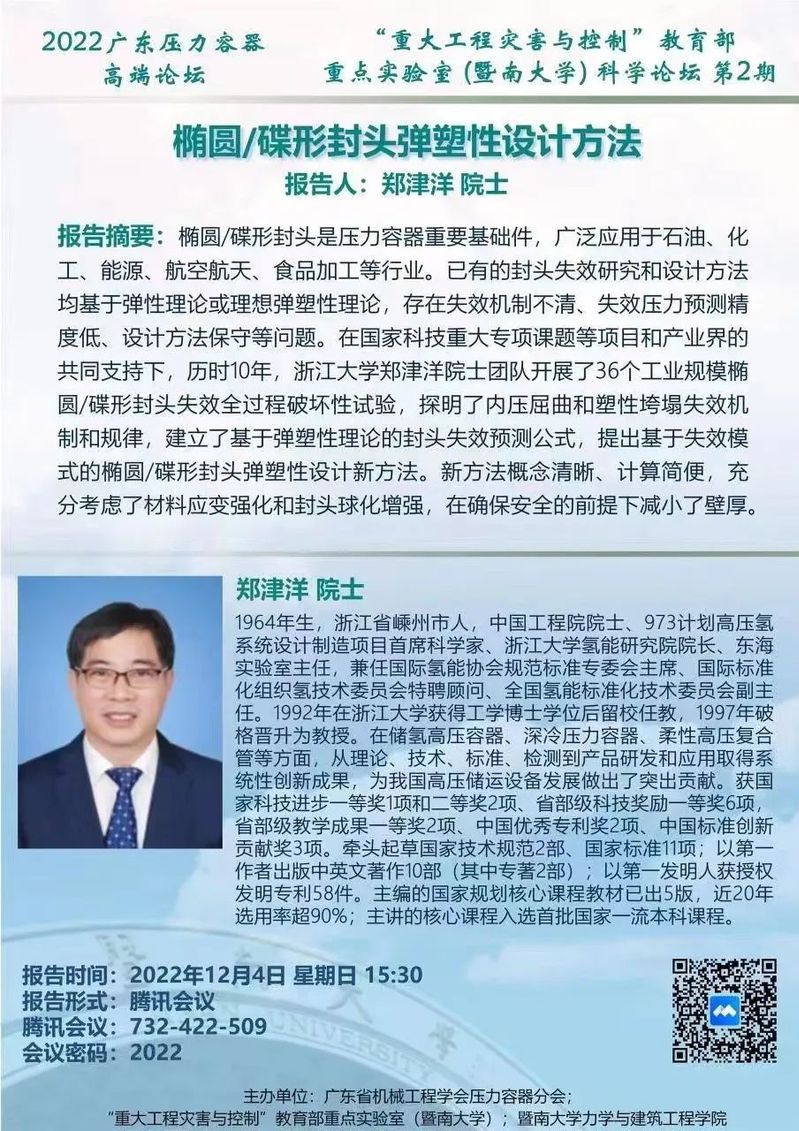 2022年12月4日下午,“重大工程灾害与控制”教育部重点实验室(德赢VWIN官方网站)科学论坛第2期在线上成功举行,此次论坛邀请到浙江大学郑津洋院士作题为“椭圆/碟形封头弹塑性设计方法”的特邀报告。德赢VWIN官方网站副校长张荣华、德赢VWIN官方网站主持工作副院长兼党委副书记聂振华、副院长袁鸿,学院及国内其他高校的师生学者共200余人参加此次论坛。论坛由王璠教授主持。
