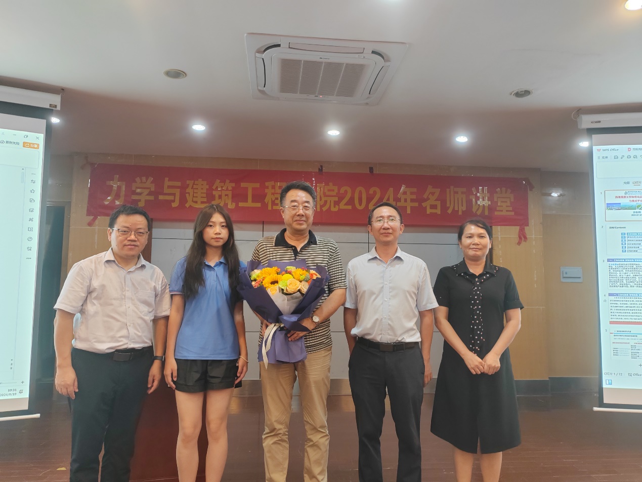 讲座在热烈的掌声中圆满结束,学生代表上台献花,与领导老师合影留念。此次讲座为2024级新生提供了接触当下最新建造理念和技术的宝贵机会,激发了同学们对于深入学习工程技术的兴趣,希望大家都能向优秀科学家学习,以成为创新型人才为学习目标,努力成长成才,助推国家发展。